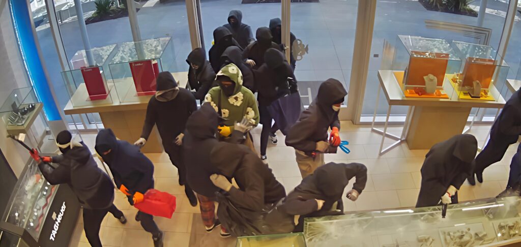 California (National Desk): Twenty-five masked robbers, armed with hammers and guns, arrived in six cars and looted jewelry worth one million dollars from a jewelry store. A series of daylight attacks on jewelry stores in California has created an atmosphere of fear among local business owners. Shops run by Indians in particular are being targeted repeatedly. Large groups of thieves are involved in these incidents, who use stolen cars and break glass counters with hammers to steal valuable jewelry before fleeing the scene. CCTV footage of the incident has surfaced.